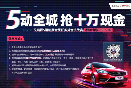 上市当天,艾瑞泽5 运动版以在全国多地进行开箱直播的形式,通过抽奖、产品解答等多轮互动环节,与消费者频繁互动,让其深刻感知艾瑞泽5 运动版的进阶实力和年轻运动化风采。此外,6月15日至6月30日,奇瑞汽车发起艾瑞泽5 运动版#5动全城抢十万现金#全民任务抖音挑战赛活动,参与活动并拍摄视频将有机会赢得官方提供的礼品及购车权益。